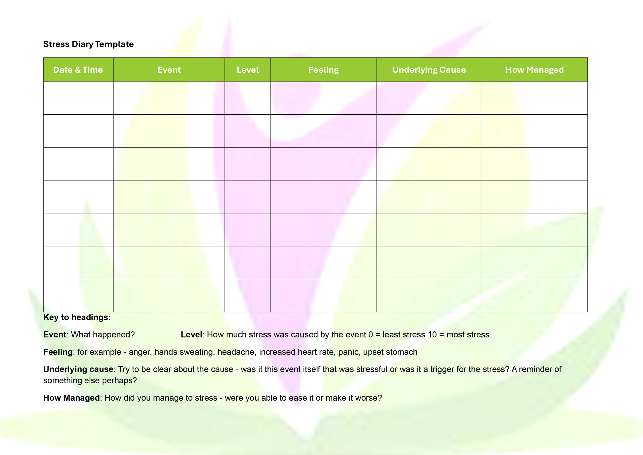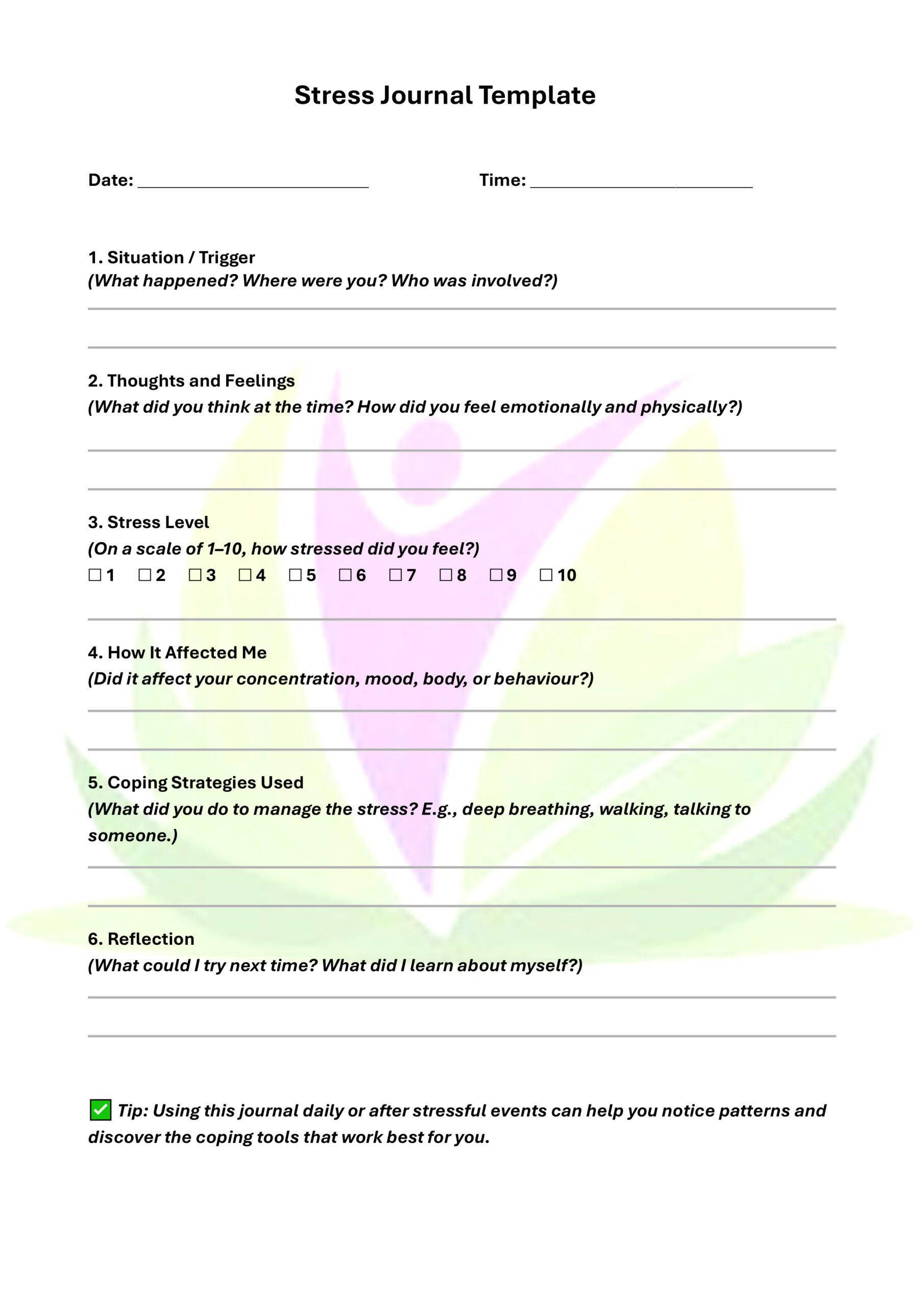 - Recognising your reactions: Writing down physical symptoms (like headaches or tiredness) and emotional responses (such as frustration or worry) shows how stress affects you personally.